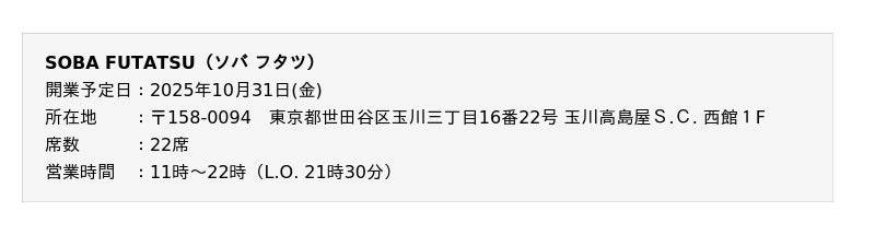 「わたしたちの発想を形にし、人々に幸せを届ける」ことを理念に、グループスローガン「ウェルネスデザイン」を掲げるマッシュグループにおいて飲食部門を担う株式会社マッシュフードラボ(代表取締役社長:近藤広幸、本社:東京都千代田区)は、最高級鰹節から丁寧に引いた出汁で味わう高品質の国産十割蕎麦を提供しつつも気軽に使いたくなるという二つの要素を兼ね備えたセルフサービスの蕎麦店「 SOBA FUTATSU(ソバ フタツ、以下FUTATSU)」を、2025年10月31日(金) 、玉川高島屋S・C 西館1Fにグランドオープンします。