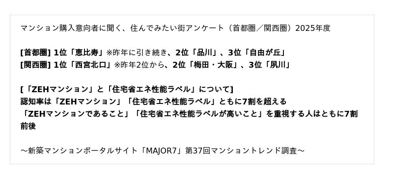 新築マンションポータルサイト「MAJOR7」(メジャーセブン=住友不動産・大京・東急不動産・東京建物・野村不動産・三井不動産レジデンシャル・三菱地所レジデンスの7社~五十音順)では、このたび全国のマンション購入意向者約66万人を対象に、「住んでみたい街アンケート」を実施いたしました。その結果をまとめましたので、ご報告いたします。