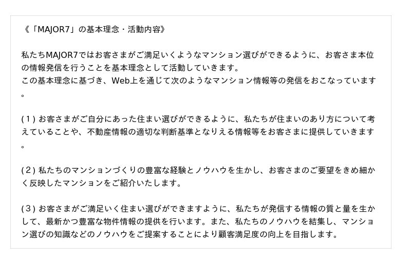 MAJOR7を運営する不動産大手7社の新築分譲マンションは、全国のマンション供給戸数の約22%(2024年)を占めており、その7社の豊富かつ詳細なマンション販売情報を、MAJOR7のサイト上で提供しております。他業種をみても、同業大手が共同でお客さまに有益な情報を提供している例は珍しく、サイトの年間来訪数は200万PVを超え非常に多くの方に利用されており、「住まい探しの場として高い注目を集めています。