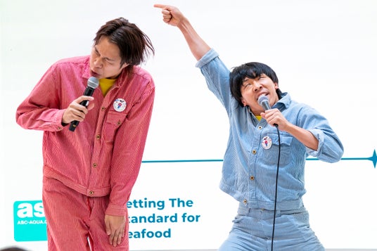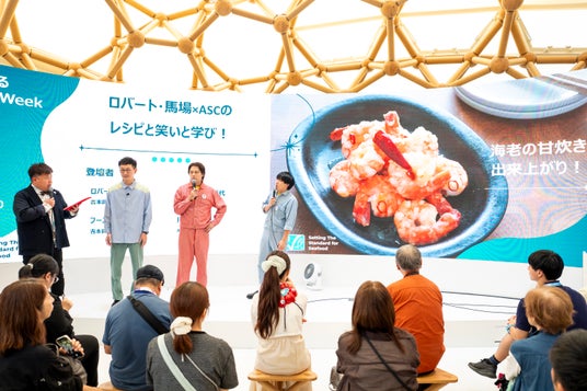 当日は、西代さんの軽快なMCでスタートし、ロバート・馬場さんとASCジャパン川田直美による"水産養殖の学びの時間"では、ASC認証の役割や「サステナブル・シーフード」についてわかりやすく解説しました。続いて、馬場さんが考案したオリジナルレシピ「エビの甘炊き」と「エビのじゃがいもチヂミ」を紹介し、フースーヤが無茶ぶりされたエア食リポで会場を大いに盛り上げ、終始笑いと学びにあふれる時間となりました。