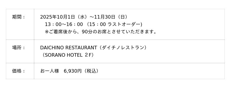 株式会社立飛ホスピタリティマネジメント(東京都立川市/代表取締役社長:村山正道)が運営するSORANO HOTEL(ソラノホテル)では、ロビー階にある DAICHINO RESTAURANT(ダイチノレストラン)にて2025年10月1日(水)より、秋のティータイムメニュー「錦秋茶会 ~和のアフタヌーンティー~」のご提供を開始いたします。少しずつ深まる秋の気配を感じながら、秋の味覚とともに五感を満たす至福の時間をお届けします。