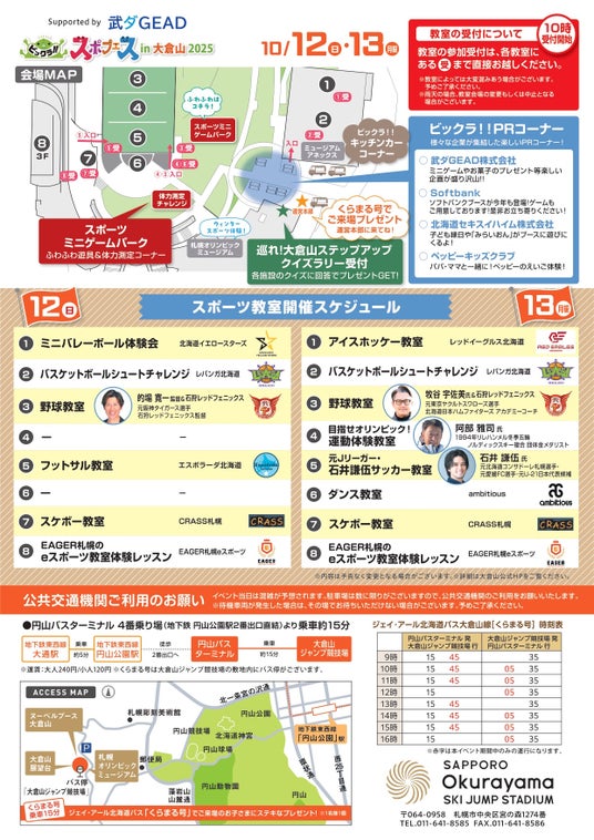 イベントでは、 スポーツ体験教室のほか、ダンス体験教室、さらに今年はe-Sportsやバスケットボール教室、そして札幌オリンピックミュージアム館長で1994年リレハンメル冬季オリンピックノルディック複合団体金メダリスト 阿部雅司氏による幼児向けの運動体験教室も登場!また、ジェイ・アール北海道バスによるバスの特別展示も開催いたします!