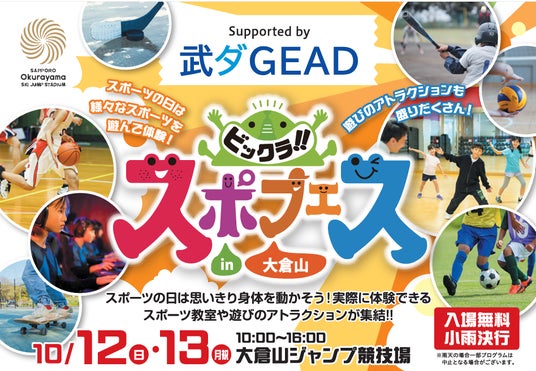 大倉山ジャンプ競技場では、スポーツの日にあわせて10月12日(日)・13日(月祝)の2日間、例年好評をいただいている、スポーツ体験イベント『「ビックラ!!スポフェスin大倉山」 supported by 武ダGEAD』を開催します。