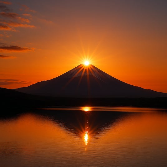 夕暮れ時、太陽が富士山の山頂へと沈む瞬間に現れる神秘の絶景。