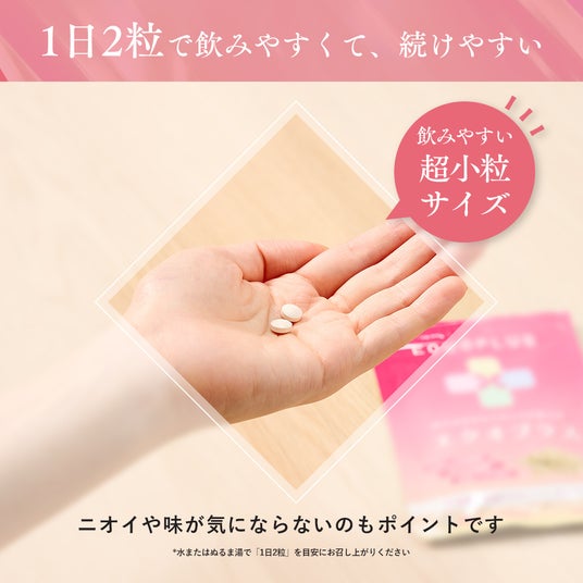 開発で最も大切にしたのは、ターゲットとなる40代・50代女性のリアルな声です。 サプリを飲み慣れていない方でも、毎日無理なく続けられるよう、直径わずか8ミリの小さな錠剤を採用しました。
