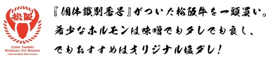 ホルモン、ギアラ、センマイなどその日のおすすめの松阪牛のホルモンを、当店オリジナルの塩だれに漬け込み、ボリュームたっぷりでご提供いたします。