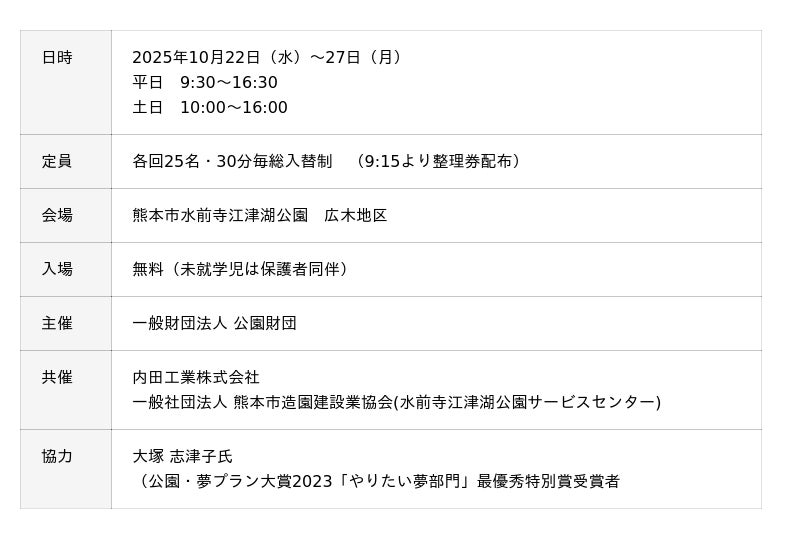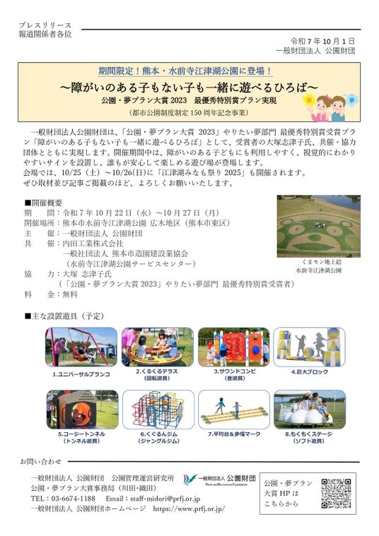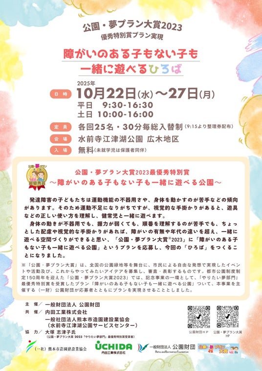 「公園・夢プラン大賞」は、全国の公園緑地等を舞台に、市民による自由な発想で実現したイベントや活動及び、これからやってみたいアイデアを募集し、審査・表彰するものです。都市公園制度制定150周年を迎えた「公園・夢プラン大賞2023」では、記念事業の一環として、「やりたい夢部門」最優秀特別賞を受賞したプラン「障がいのある子もない子も一緒に遊べる公園」ついて、本事業を主催する(一財)公園財団が応募者とともにプランを実現させることとしました。
