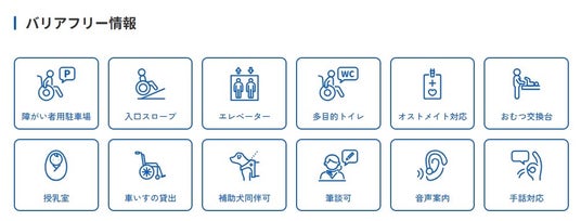 ・観光施設の「車いす貸出」「多目的トイレ」「授乳室」などの情報を、わかりやすいアイコンで表示。