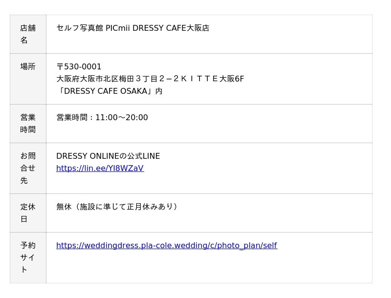 セルフ写真館 PICmii DRESSY CAFE大阪店 概要