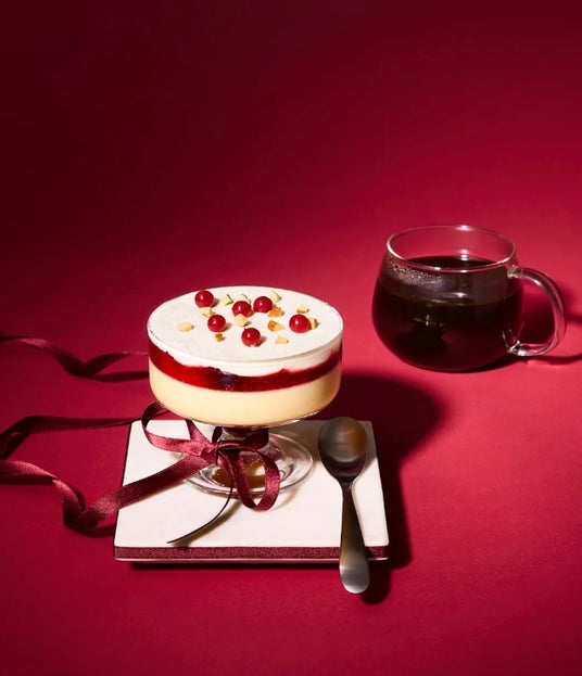 卵とミルクの風味をしっかりと感じられる、どこか懐かしい味わいのクラシックなプリンに、ラズベリーとストロベリーを煮詰めたソースと、3種類のベリーを合わせた甘酸っぱいコンポートを重ねました。ふんわりと軽いホイップクリームが全体をやさしく包み込み、トッピングにはローストアーモンドの香ばしさとレッドカラントの鮮やかな彩りを添えました。