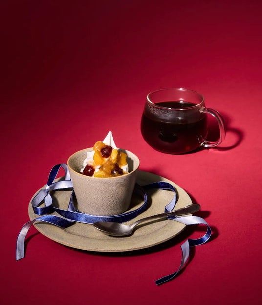 北海道・美瑛牛乳を使用して作ったシンプルな素材の甘みを感じられるミルクソフトに、レーズンやアプリコット、いちじくなどのドライフルーツにフレッシュな生姜とスパイスを加え、りんごジュースやレッドカラントのピューレと共に丁寧に炊き上げたホリデージャムをトッピングしました。やさしい甘さのミルクソフトと、スパイス感やドライフルーツの食感のコントラストを、神戸阪急カフェのゆったりとした居心地の良いソファでお楽しみください。