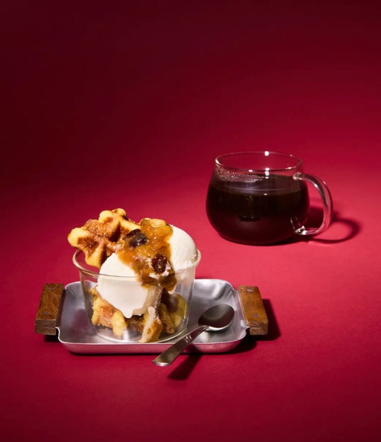 リエージュ ワッフルのミニサイズをパフェ仕立てにし、ホリデージャムをトッピング。ホリデージャムには、コーヒーのフレーバーホイールに沿ったさまざまなフルーツが丁寧に閉じ込められ、見た目にも華やかできらきらとしたホリデー感を演出します。クラフトアイスクリームブランド「HiO ICE CREAM」の美瑛シングルオリジンミルクアイスも乗せ、焼きたてのワッフルと溶け合います。