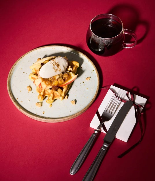 レーズンやアプリコット、いちじくなどのドライフルーツにフレッシュな生姜とスパイスを加え、りんごジュースやレッドカラントのピューレと共に丁寧に炊き上げたホリデージャムを、焼きたてのリエージュ ワッフルにトッピング。フレッシュのりんごと合わせることで、みずみずしさと華やかな香りを一層引き立てます。たっぷりと添えたホイップクリームにはシナモンを重ねることで、味わいに奥行きをプラス。焼きたてワッフルの温かさとの絶妙な温度変化もお楽しみください。