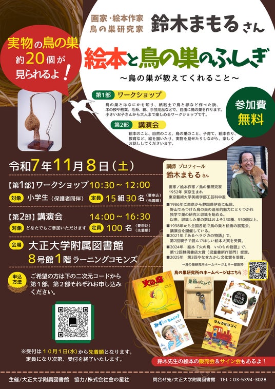また学びの拠点となる本学附属図書館は、株式会社金の星社※協力の下『絵本と鳥の巣のふしぎ ~鳥の巣が教えてくれること~』を同時開催します。当イベントでは、画家・絵本作家・鳥の巣研究家の鈴木まもる氏をゲスト講師としてお招きし、鳥の巣について理解を深めるワークショップや講演会を行います。