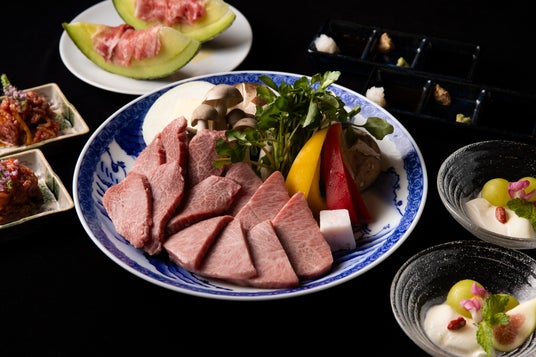 夜は、すき焼き・しゃぶしゃぶ・ビフテキ・オイル焼きの4つの調理法を軸に、部位ごとの個性を引き出すコースや食べ放題をご用意。自家製熟成生ハムや和牛刺身などの前菜から、シャトーブリアンやおまかせ盛りまで赤身と霜降りの絶妙なバランスを堪能できる贅沢な時間をお楽しみいただけます。