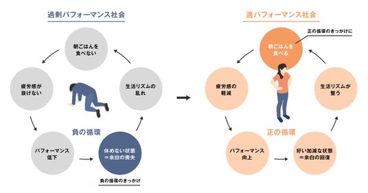 忙しさに追われ、生活リズムが乱れ、疲れがたまっていく--。そんな負の循環を断ち切るきっかけとして、「朝」に注目。心と体にエネルギーをチャージする朝ごはんを食べることで、疲労感が軽減、パフォーマンスが向上し、生活リズムが整う--といった正の循環を生み出していくことを目指します。