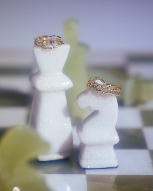 やや大ぶりなトップのリングは1本で主役級。ピーチカラーのアンデシンをアクアマリンとダイヤモンドで囲んだデザインは、夜が明けていく空の様子を表現しています。天然石を贅沢にあしらった、限定コレクションに相応しいスペシャルなアイテムです。