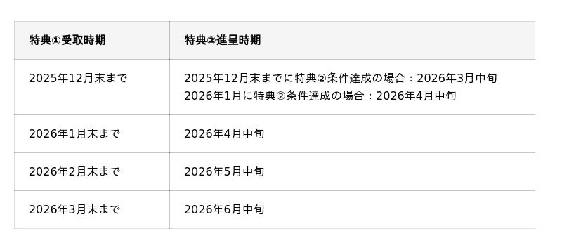 - システムの都合により、特典進呈が予定時期より遅れる場合があります。※ 特典は、課税の対象となる場合がありますので所轄税務署にご確認ください。