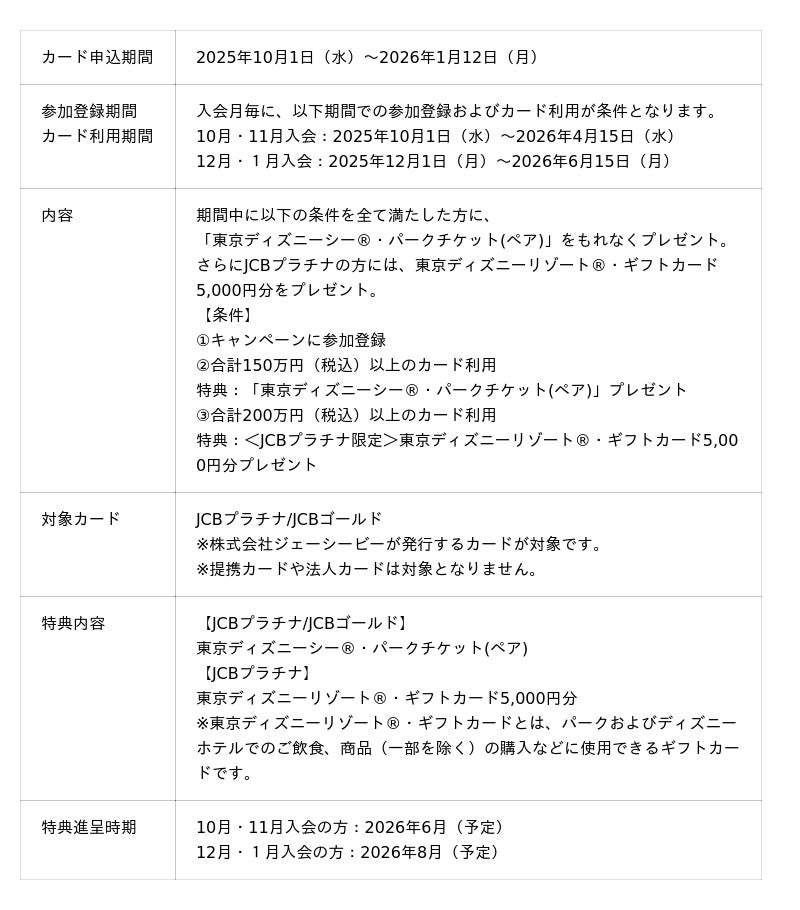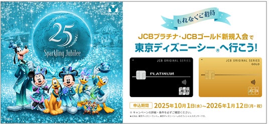 株式会社ジェーシービー (本社:東京都港区、代表取締役会長兼執行役員社長:二重 孝好、以下:JCB)は、2025年10月1日(水)から2026年1月12日(月)の間にJCBプラチナもしくはJCBゴールドに新規入会されたお客様を対象に、「東京ディズニーシー(R)・パークチケット(ペア)プレゼントキャンペーン」を実施します。条件達成で、もれなく東京ディズニーシー(R)・パークチケット(ペア)をプレゼント!さらにJCBプラチナに新規入会されたお客様には、東京ディズニーリゾート(R)・ギフトカード5,000円分もプレゼント!