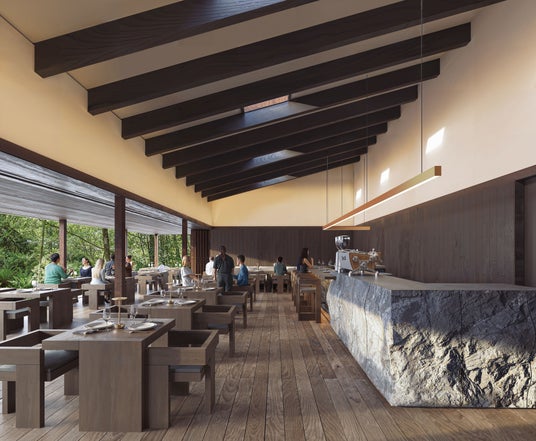 テラス席も併設し、森とつながる開放的なカフェレストラン。キッズパークに隣接し、自然の恵みを味わうカフェメニューやコース料理を提供予定。子どもたちが遊ぶ姿を眺めながら食事や会話を楽しんだり、家族全員でゆったりとくつろぎのひとときを過ごしたり。世代を超えて心地よい時間を共有できる空間。