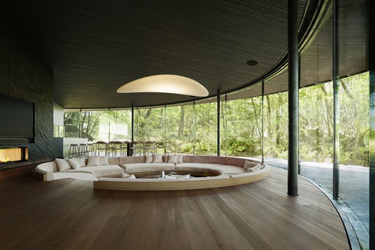 家の形状は不完全な楕円であり、地形に溶け込むように設計。この有機的な形状により、家は地面から控えめに浮かび上がる。下部のファサードは主にガラスで構成され、風景の広大な眺望を枠に収め、自然光が内部に入り込むように。