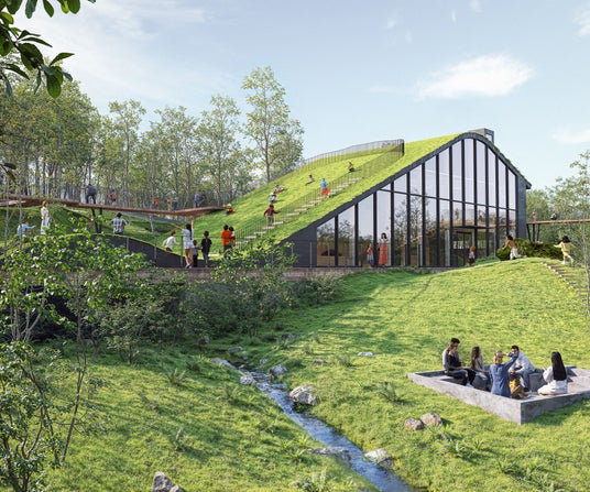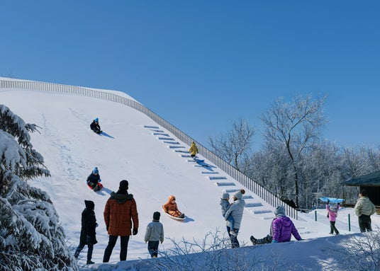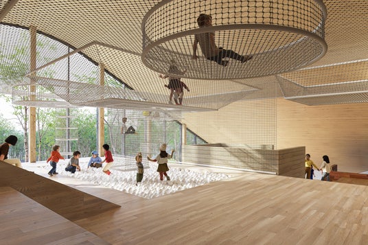 草スキーやそり遊びも可能な大屋根スロープを用意。大自然のなかで、自由に走って、登って、滑って。夏は涼やかな森で思いきり外遊び、冬は雪に覆われた大屋根でそり遊びを楽しむことができます。温かな室内には子どもとともに大人も楽しめるアスレチックを設置。アスレチックで体を動かしたり、本を読んで過ごしたりと創造力や協調性を育むきっかけに。たくさんの発見を促す、遊びと学びがひとつになった子どもたちの成長を支える居場所。キッズエリアの設計は幼稚園、保育園で機能的かつ美しい建物を創り続け、数々の実績とコンクール等で入賞している日比野設計が担当。