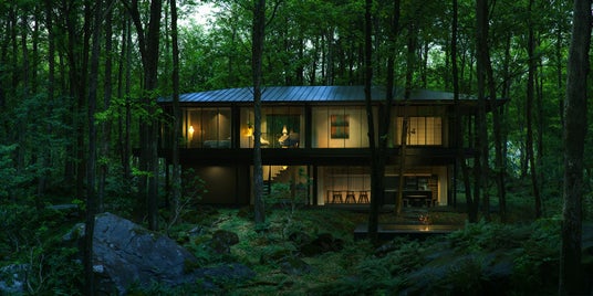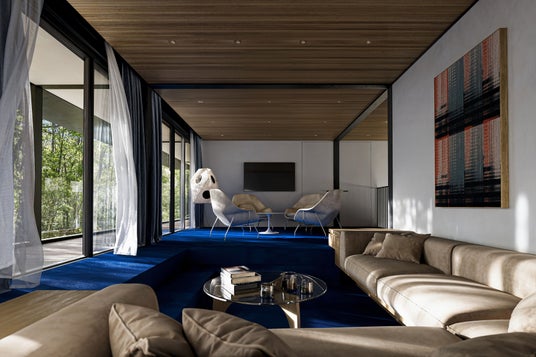 北軽井沢の豊かな自然に佇む「MASU」は、片山正通氏が数寄屋をモダニズムの視点で再解釈した建築です。グリッドで構成された空間は吹き抜けによる開放感を持ち、360度デッキや大きな窓から森とつながります。四季折々の自然との一体感に加え、東西の融合を体現するインテリアや家具、アートが調和し、唯一無二の空間です。