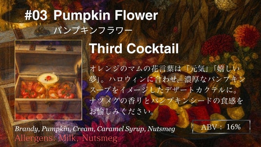 ハロウィンに合わせ、濃厚なパンプキンスープをイメージしたデザートカクテルに。ナツメグの香りとパンプキンシードの食感を添えました。