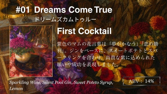 ジンをベースにスイートポテトとスパークリングを合わせ、紫に込められた願いや成功を表現しました。
