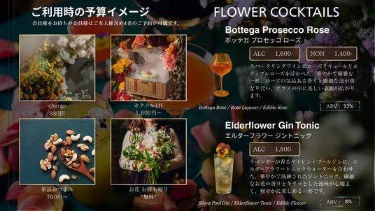 チャージは880円、単品カクテルは1,600円からと、一般的なバーに比べてリーズナブルにお楽しみいただける価格設定です。さらに、ご利用後には店内を彩ったお花をお持ち帰りいただける特別なサービスもご用意しています。