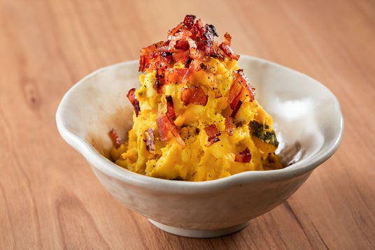 秋の人気メニュー「黄色いポテサラ」は、サツマイモとカボチャの優しい甘みにクリームチーズで濃厚さを加えた1品。