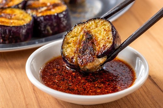 大とろホルモン入りの餃子の餡をジューシーな茄子で挟んで焼き上げました。
