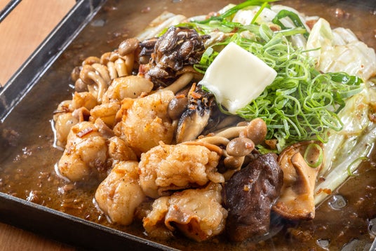 名物「大とろホルモン鉄板焼き」の秋の味わいは季節感あふれる「3種のきのこ」を組み合わせ、バター醤油でコク旨に仕上げました。