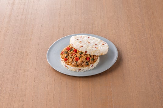 雑穀ライスバーガー ガパオライス味爽やかなバジルの香りと、ピリ辛の味付けが食欲を刺激する一品。たまねぎ、赤ピーマン、バジルの3種の野菜などを具材として採用し、本格的なエスニック味に仕上げました。