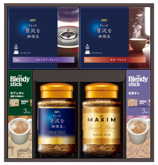 AGF(R)コーヒーセレクションギフト(CA-30D)香りを楽しむ「ちょっと贅沢な珈琲店(R)」ドリップコーヒーや、クリー ミーなカフェオレが楽しめる「ブレンディ(R)」スティックなど、AGF(R)おすすめを揃えたギフトセットです。