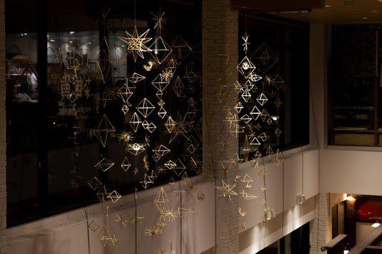 リトアニア共和国農業省公認のソダス作家・本多桃子氏による、麦わらの茎を編み上げた美しい装飾。ソダスの特徴の一つである星と、大きいものでは30cm近い氷や雪のモチーフ、多面体の立体などを組み合わせた空間で空気の流れを受けて揺れるソダス展示は、1階・2階のどちらから眺めても楽しめます。