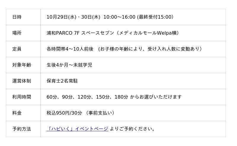 2025年10月29日(水)・30日(木) 浦和PARCO 7F メディカルモールWelpaが検診・健診受診者を対象に一時保育無料サービス