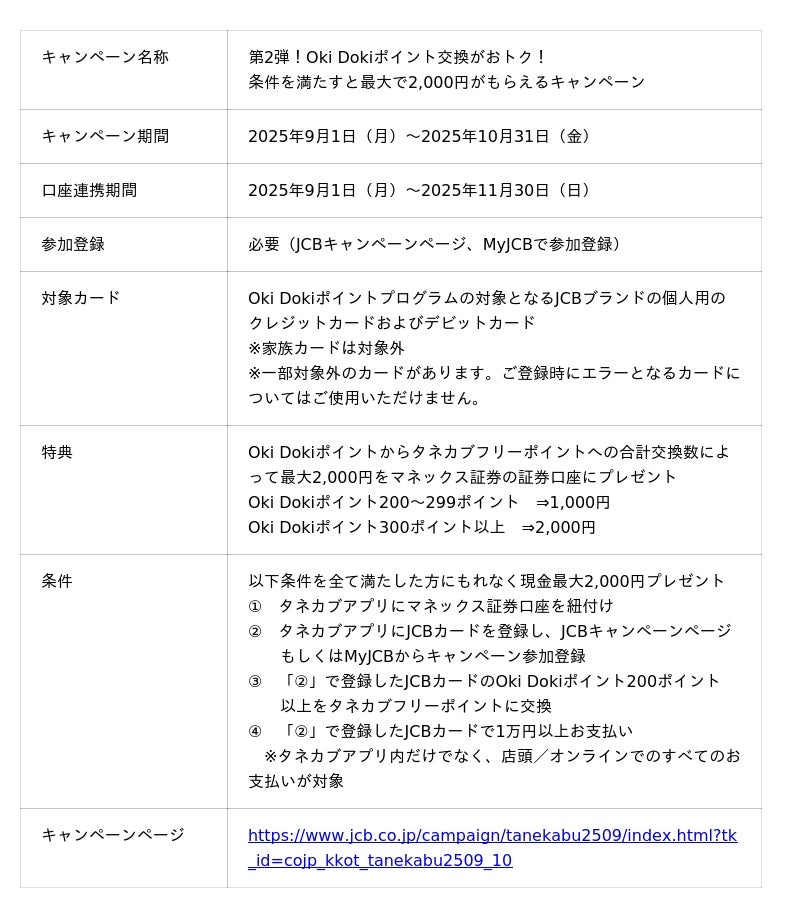 2025年9月1日(月)から2025年10月31日(金)までJCB主催の「第2弾!Oki Dokiポイント交換がおトク!条件を満たすと最大2,000円がもらえるキャンペーン」を実施中です。本キャンペーンは、より多くのお客様に「タネカブ」をご利用いただくことで、取り扱い企業様のお取り組みや、株式投資への関心を高めていただくことを目的に実施しております。