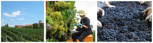 <神戸ワイナリーに広がるぶどう畑> <ぶどうの収穫風景> <ワインの製造工程 ぶどうの選果>