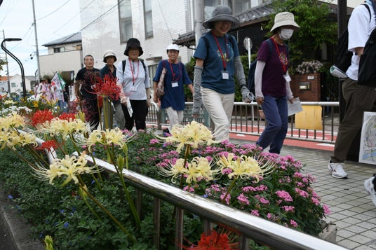今回は60~80代までの約30名が参加し、スタート地点の京成高砂駅から高砂天祖神社(高砂2-13-13)や奥戸ローズガーデン(奥戸9-15-16)等、全5か所を巡って、ゴールの八剱(やつるぎ)神社(奥戸8-6-22)を目指すツアーです。道中に咲いている彼岸花に癒されながら、参加者全員、見事歩き切りました!