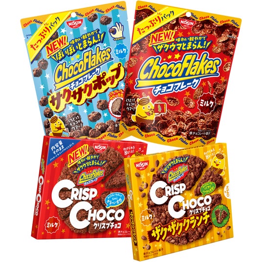 「チョコフレーク ミルク たっぷりパック」「チョコフレーク サクサクポップ たっぷりパック」「クリスプチョコ」「クリスプチョコ ザクザククランチ」各1個をセットにしました。