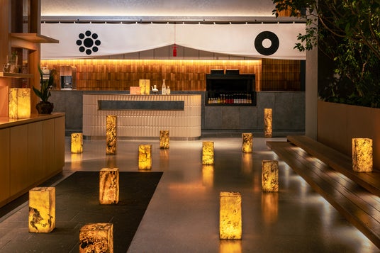 パブリックスペース「OMOベース」では、夜の熊本城を思わせる和の装飾が空間を彩り、城下町の賑わいを現代に映し出します。蛇の目紋や九曜紋(*4)ののれん、地図石など熊本城ゆかりの意匠がさりげなく配され、凸凹テラスには震災で瓦礫となった瓦を用いた灯りが城の存在を身近に感じさせます。柔らかく揺れる石灯りの周りに集う時間は、宴の始まりを待つ高揚感に満ち、熊本らしさを余すところなく体感できる特別な夜を演出します。