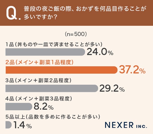 【普段料理をする500人に調査】約4割が、夜ご飯の品目数は「2品(メイン+もう1品)作ることが多い」と回答