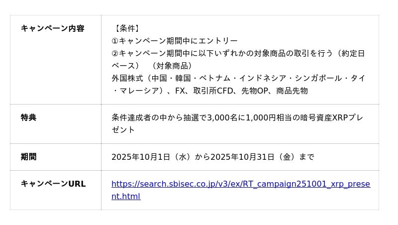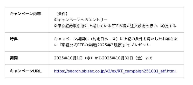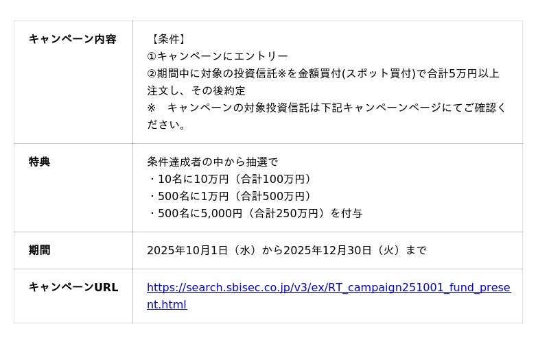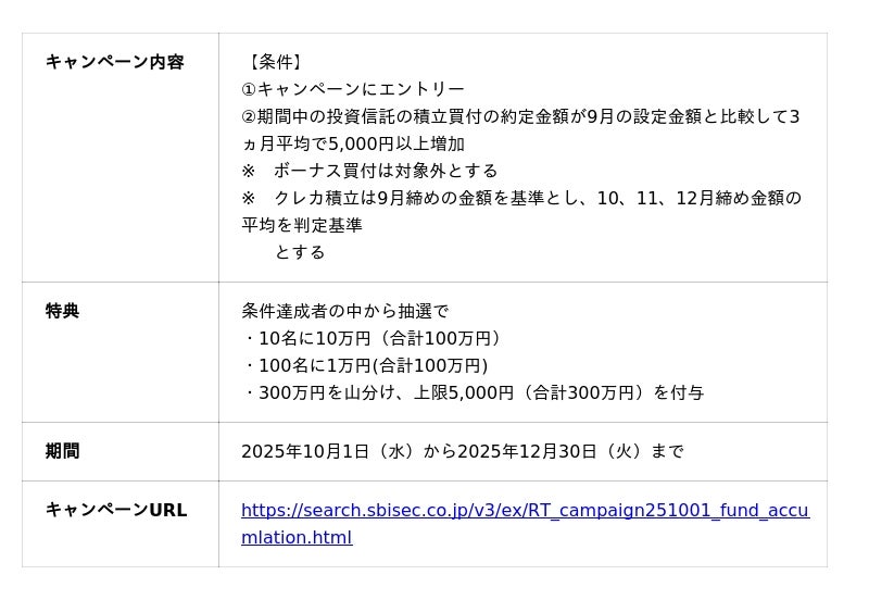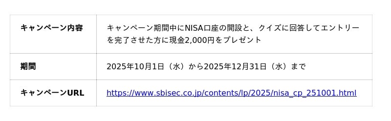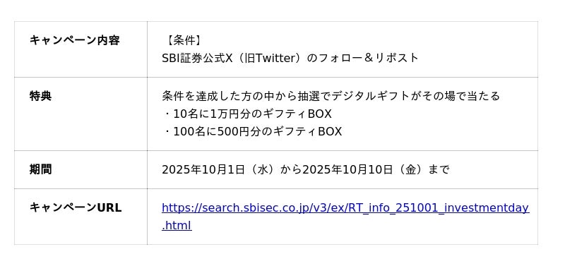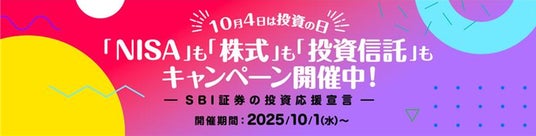 株式会社SBI証券(本社:東京都港区、代表取締役社長:高村正人、以下「当社」)は、2025年10月4日(土)の「証券投資の日」に合わせて、2025年10月1日(水)より、皆さまの資産形成を応援するため、NISA口座開設や各種取引を条件とした、合計6つのキャンペーンを実施しますのでお知らせします。