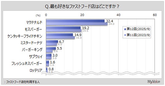 ファストフード店利用者に、最も好きなファストフード店を聞いたところ、「マクドナルド」が32.4%、「モスバーガー」が19.2%、「ケンタッキーフライドチキン」が14.9%です。
