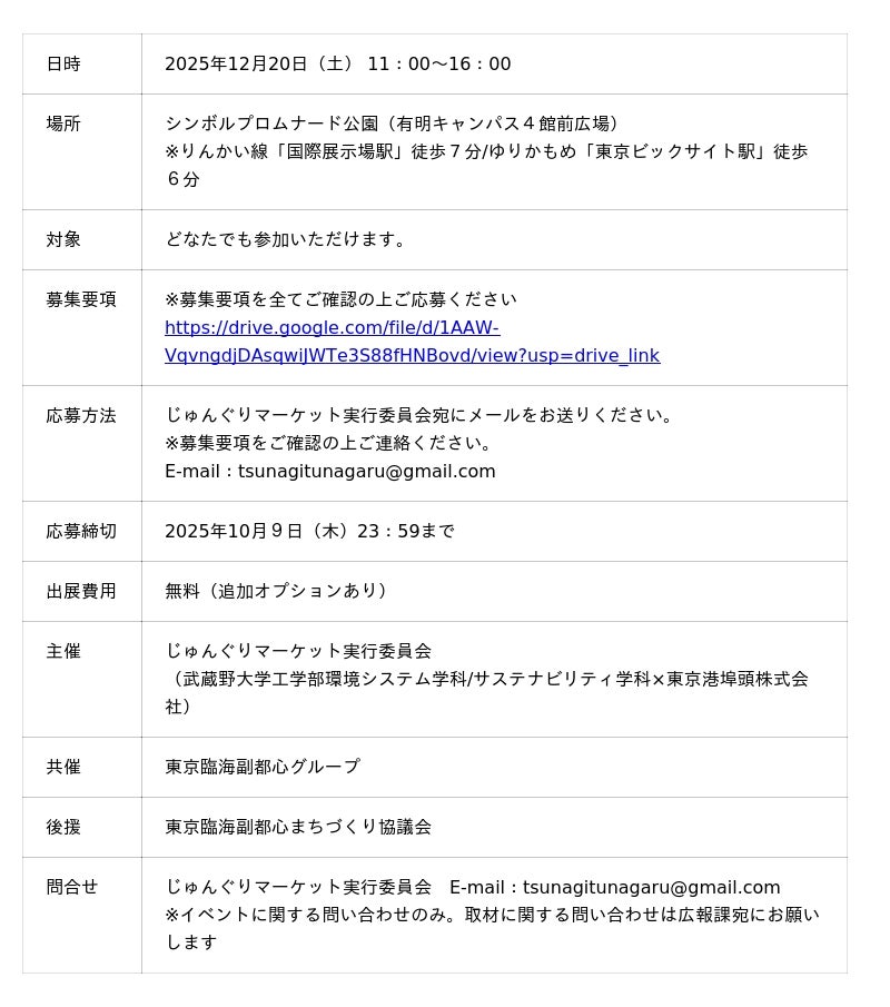 武蔵野大学工学部サステナビリティ学科(東京都江東区)は2025年12月20日(土)に、シンボルプロムナード公園 (有明キャンパス4号館前広場)で「じゅんぐりマーケット」を開催します。