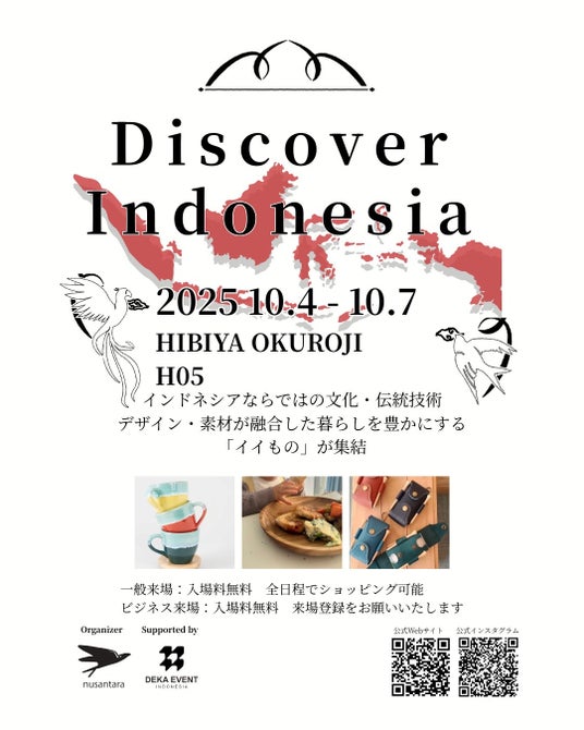 合同会社ヌサンタラジャパン(本社:神奈川県、代表:阿部 安紀子)は、2025年10月4日(土)~7日(火)の4日間、日比谷OKUROJIにてインドネシアの多彩な企業・ブランドが集う展示・商談イベント「Discover Indonesia」を開催いたします。