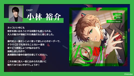 持ち前の明るさと優しさでWITHPERのリーダーをつとめる、国語担当の補講男子、藤代晴仁(ふじしろ・はると)の記念すべきキャラクターソング2曲目は、Gakken監修のもと「百人一首(競技かるた)」について歌い上げるビッグバンドジャズ。いつも柔らかく優しい藤代先生の"本気"モードを描いた表情・ヘアスタイル・衣装にも注目だ。