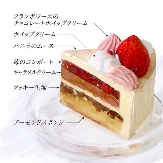 チョコレートとバニラが贅沢に重なり合うケーキ。3種類のチョコレートをブレンドしたなめらかなムースと、バニラビーンズをたっぷり加えたクリームが相性抜群。食感のアクセントとして乾燥クレープを忍ばせています。