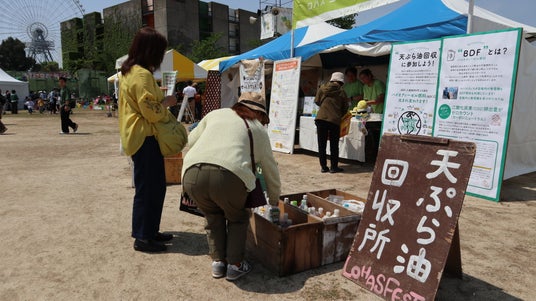 会場内に使用済み天ぷら油、牛乳パックなど、ご家庭の不用品を回収する「エコリサイクルコーナー」を設けています。特に使用済み天ぷら油は、会場で消費する電力をBDFで全てまかなえる量の回収を目指しています。また、マイ食器・マイボトルの持参を呼び掛け、会場内はリユース食器(何度も繰り返し洗って使用)だけを使用し、使い捨て容器を減らしてゴミゼロを目指しています。